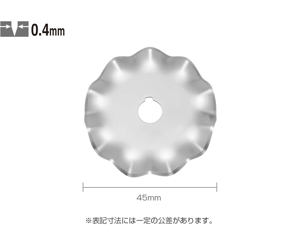 直径45ミリのウェーブカット用円形刃です。布・紙などにお使いいただけます。1枚入り。 ※セーフティロータリーカッターL型専用商品です。(2020年12月現在)