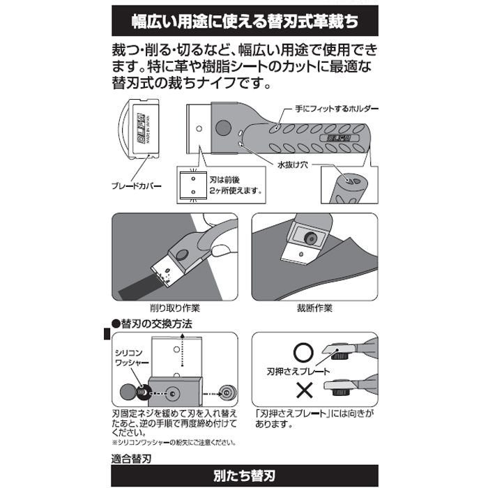 切る、裁つ、そぐ、はがす、削るなど、幅広い用途に使える革たちです。特に革や樹脂シートのカットに。