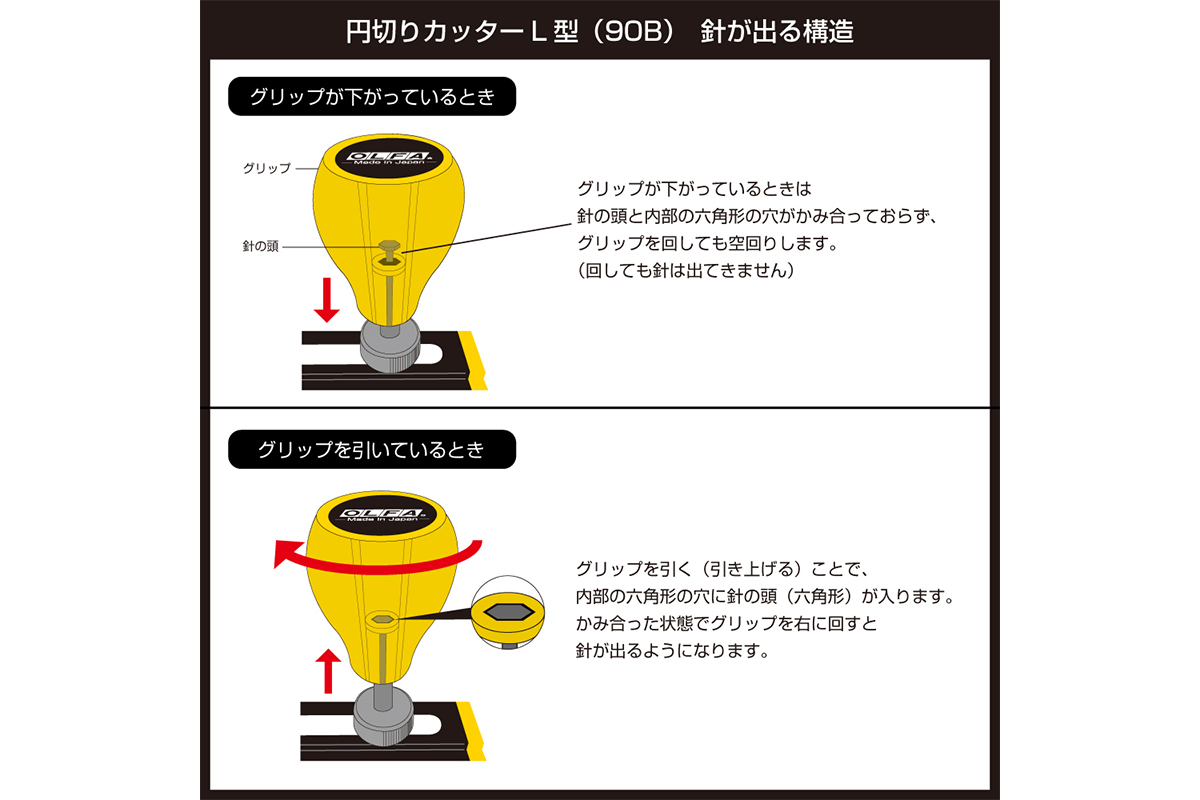 ※センターピンの長さを調整するときは、グリップを引きながら回してください。