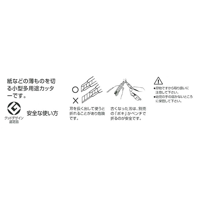 「小型」カッターナイフ用の通常替刃。紙など薄物を切るのにお使いいただけます。刃厚0.38ミリ。