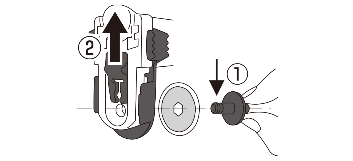 刃が落ちないように、①を指で押さえながら②を押し上げて外してください。溝のある方に刃をセットし、本体に取り付けてください。