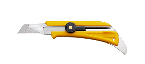 刃のぐらつきが少なく、長い刃渡りでのカットが可能な特殊形状ブレードホルダーの大型カッターナイフ。カーペットのカットなどに。カーペットの縁を押さえるのにも便利なツメ付き。